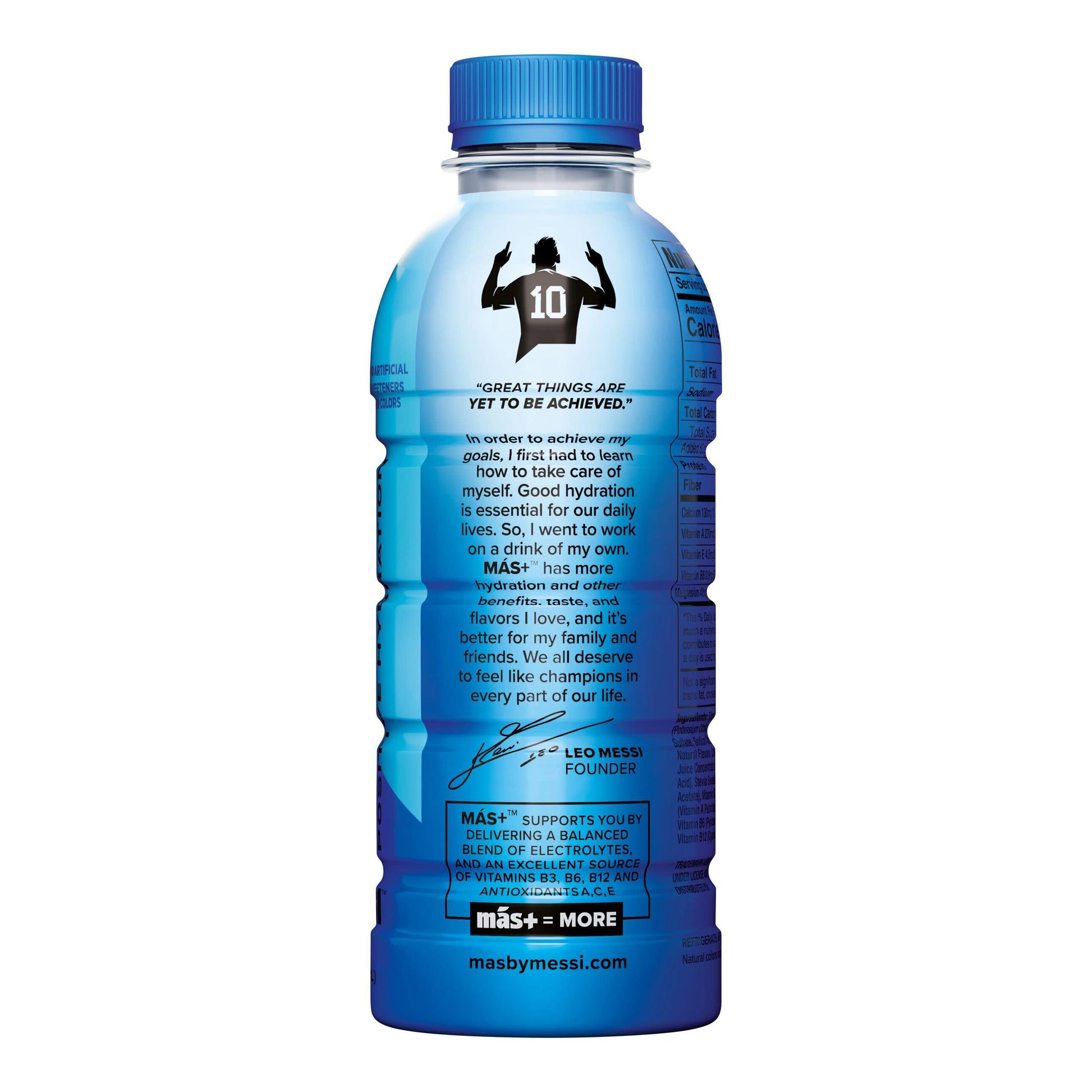 MÁS+ by Messi was created to deliver clean hydration with purpose. With natural flavours, electrolytes, and vital vitamins, MÁS+ provides refreshing, functional fuel for any activity.